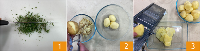 Para preparar el pastel de patatas, lo primero que hay que hacer es picar el romero con un cuchillo 1 y reservar. Luego, pelar las patatas 2 y con una mandolina cortarlas en rodajas de aproximadamente 3 mm de grosor 3.