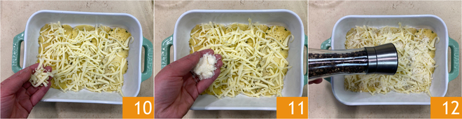 Cubre la superficie con la provola rallada 10, luego añade el queso rallado 11 y una pizca de pimienta 12. Continúa así hasta terminar con los ingredientes, al final deberías obtener 6 capas de patatas.