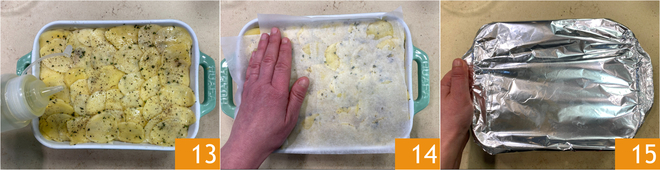 Condimenta la última capa con aceite 13, cubre primero con una hoja de papel de horno 14 y luego con una hoja de aluminio 15. Hornea en horno estático a 220°C durante 70 minutos.