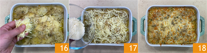Transcurrido este tiempo, verifica si las patatas están cocidas, luego añade en la superficie del pastel la provola 16 y el parmesano 17. Completa la cocción a la misma temperatura en modo grill durante 5-8 minutos. El pastel de patatas está listo para ser servido 18.