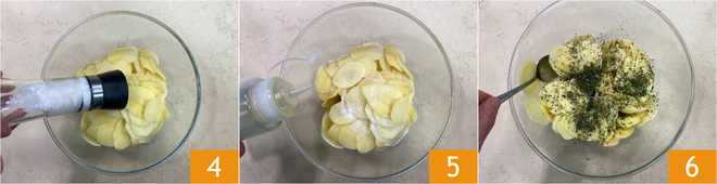 Condiméntalas luego con sal 4, pimienta, aceite 5 y el romero picado. Mezcla bien 6 para que el condimento se distribuya en todas las rodajas 6.