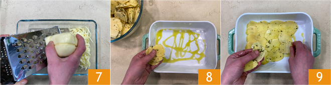 Con un rallador de agujeros grandes, ralla la provola 7 y reserva. En el fondo de una fuente de horno de 25x10,5 cm, vierte un chorrito de aceite y coloca las rodajas de patata para formar una primera capa 8 9.