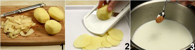 Lava las patatas, pélalas 1 y córtalas en rodajas finas 2 con una mandolina (deberán tener un grosor de 1 mm/1,5 mm). Ralla el gruyer y resérvalo. Calienta la leche en un cazo, cuando esté caliente añade el diente de ajo cortado por la mitad y la nuez moscada 3, sala y pimienta.
