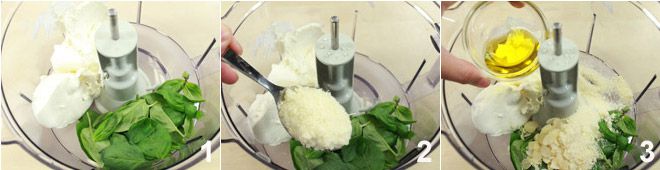 Comenzad preparando la crema de ricotta con albahaca: poned en un procesador de alimentos la ricotta, las hojas de albahaca lavadas y bien secas 1, las almendras laminadas, el queso rallado 2 y el aceite de oliva virgen extra 3.