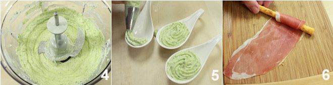 Triturad (a pulsos, para evitar que la albahaca se caliente), hasta obtener una mezcla cremosa. 4 Pasadla a un bol y corregid la crema con sal y pimienta. Poned la crema de ricotta con albahaca en una manga pastelera con boquilla de estrella y repartidla en cuencos individuales 5, decorando con una hojita de albahaca y láminas de almendra. Envolved luego cada grissini con una loncha fina de jamón crudo 6 y servid vuestros aperitivos con la crema de ricotta y albahaca.