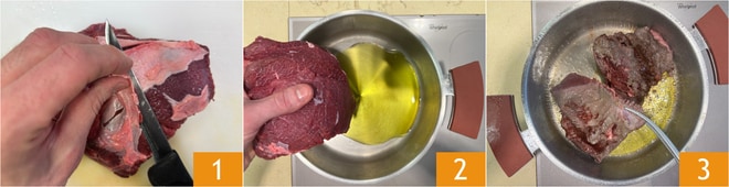Para preparar la carrillada de ternera con alcachofas, lo primero que debéis hacer es preparar el Caldo de carne con nuestra receta y mantenerlo caliente. Limpiad la carne eliminando la membrana 1. En una cacerola, verted un chorrito de aceite, añadid la carne 2 y dorad a fuego alto, durante aproximadamente 2 minutos por cada lado.