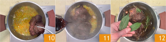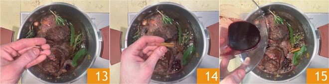 Colocad nuevamente la carne en la cacerola 10, cubrid con el vino restante (aproximadamente un litro) 11 y llevad a ebullición. En este momento, añadid el romero y el laurel 12.