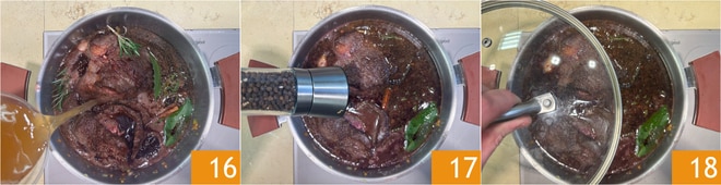 Cubrid con el caldo caliente 16, salpimentad 17. Esperad a que vuelva a hervir, luego bajad el fuego y cocinad con la tapa durante aproximadamente 3 horas 18.