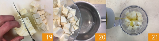 Mientras tanto, dedicad tiempo a la preparación de la guarnición. Limpiad el apionabo y cortadlo en cubos 19, luego cocinadlo en agua hirviendo salada durante 15-20 minutos 20. Escurrid y pasad el apionabo a un recipiente, luego añadid el aceite 21.