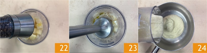 Ajustad de sal y pimienta 22, luego triturad con una batidora de inmersión 23 hasta obtener una crema lisa y homogénea. Pasadla a un cazo y mantened caliente 24.