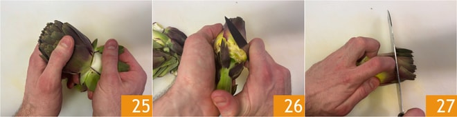Ahora pasad a la Cómo limpiar las alcachofas: eliminad las hojas externas más duras 25, luego acortad el tallo y peladlo comenzando desde la base de la alcachofa 26. Cortad las puntas 27.