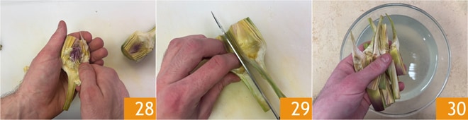 Dividid las alcachofas por la mitad y eliminad la pelusa interna 28, luego cortadlas en cuartos 29 e inmediatamente sumergidlas en agua acidulada 30.