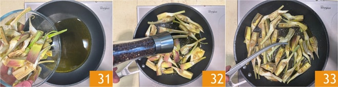 En una sartén, verted un chorrito de aceite, añadid las alcachofas 31, salpimentad 32. Saltead a fuego medio durante aproximadamente 6-7 minutos o hasta que estén doradas 33.