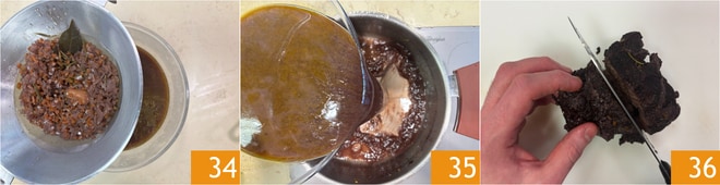 Transcurrido el tiempo de cocción de la carne, sacadla de la cacerola y colad el fondo de cocción 34. Verted nuevamente en la cacerola la parte líquida 35 y dejadla reducir al fuego durante unos treinta minutos a fuego medio-bajo; debéis obtener una salsa lo suficientemente densa como para cubrir una cuchara. Mientras tanto, cortad la carne en lonchas 36.
