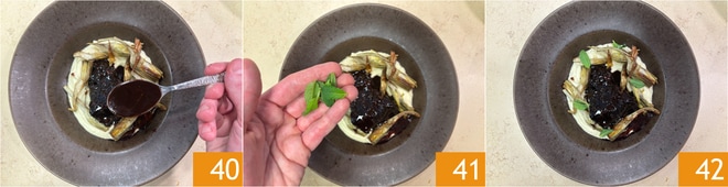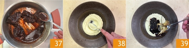 Volved a poner la carne en la cacerola y rociad con la salsa 37. Emplatad distribuyendo en el fondo del plato una base de crema de apionabo 38, luego colocad encima la carne y añadid las alcachofas alrededor 39.