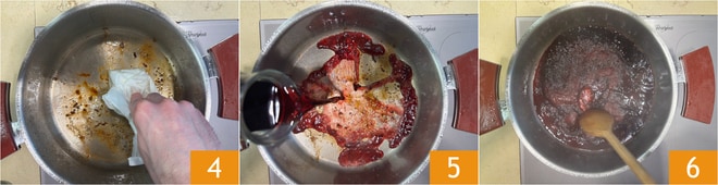 Retirad la carne de la cacerola y limpiad el fondo con papel absorbente 4, luego verted un vaso de vino tomado de la dosis total 5 y desglasad el fondo 6. Reservad el fondo de cocción.