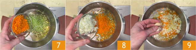 En la misma cacerola, calentad otro chorrito de aceite, luego añadid el apio, la zanahoria 7 y la cebolla 8 finamente picados. Incorporad también los dientes de ajo enteros 9 y freíd a fuego medio durante unos minutos, hasta que las verduras estén tiernas.