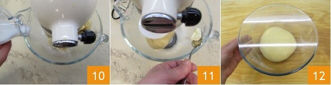 Encended la batidora a velocidad media y empezad a añadir la leche a temperatura ambiente poco a poco 9. Cuando todos los ingredientes estén mezclados, quitad el gancho y sustituidlo por el gancho de amasar: añadid una pizca de sal y comenzad a amasar a velocidad media. En este punto, añadid poco a poco la mantequilla ablandada y a temperatura ambiente: añadid un trozo 11 y cuando se haya absorbido continuad con otro. La masa deberá resultar elástica y deberá adherirse al gancho. Quitad la masa de la batidora, trabajadla dándole forma esférica y colocadla en un bol cubierto con film transparente, dejándola fermentar en el horno apagado con la luz encendida durante aproximadamente 3 horas o hasta que haya duplicado su volumen.