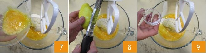 Verted entonces los huevos batidos 7, la ralladura de un limón sin tratar 8 y la grappa 9.