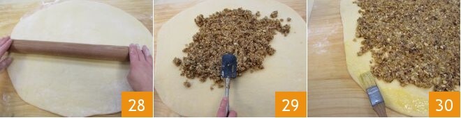 Recoged la masa que habrá fermentado y extendédla con un rodillo hasta obtener un espesor de aproximadamente 0,5 cm 28: deberéis darle más o menos una forma rectangular de unos 50x60 cm. Colocad el relleno en su interior 29, dejando un espacio de los bordes de unos 2 cm. Pincelad estos últimos con un huevo batido 30