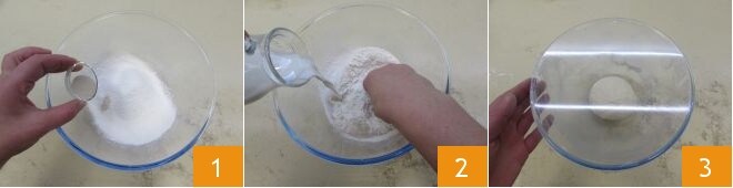 Para preparar la gubana empezad con el lievitino: en un bol grande tamizad la harina, luego añadid la levadura deshidratada 1. Agregad poco a poco la leche tibia 2 y amasad con las manos hasta obtener una mezcla homogénea y sin grumos a la que le daréis forma esférica y dejaréis reposar a temperatura ambiente cubierto con film transparente durante aproximadamente 1 hora 3.