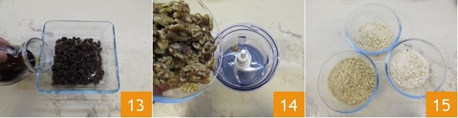 Mientras tanto, dedicad tiempo al relleno de la gubana. Lavado y luego verted las pasas en un bol para remojarlas con 100 g de marsala 13; dejad que se ablanden de esta manera durante al menos 20 minutos o más si es necesario. Mientras las pasas se ablandan, triturad las nueces en un procesador hasta obtener un picado muy fino 14. Repetid la operación también para los piñones y las almendras, consiguiendo así 3 picados separados 15.