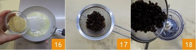 En este punto, tomad una sartén antiadherente de fondo ancho y fundid la mantequilla a fuego bajo. Una vez completamente derretida, verted el pan rallado 16: dejadlo tostar así durante unos 5 minutos. Podéis mezclarlo ligeramente con una cuchara de madera o hacerlo saltar para evitar que se queme. Cuando esté listo, apagáis el fuego y guardadlo en un bol pequeño. Luego, volved a tomar las pasas que estarán ablandadas: escurridlas 17 y trituradlas también muy finamente 18.