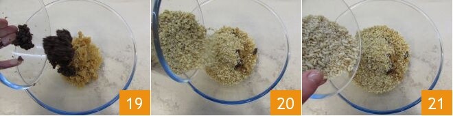 Ahora podéis comenzar a juntar los ingredientes para el relleno de la gubana: en un bol verted el pan rallado tostado, las pasas 19, las nueces 20 y los piñones 21.