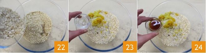 Luego añadid también las almendras 22, la ralladura de un limón sin tratar, la grappa 23 y los 10 g de marsala restantes 24.