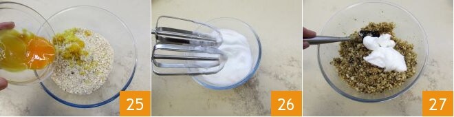 Separad las yemas de las claras y verted las yemas en el bol con los otros ingredientes para el relleno 25, mientras que en un bol aparte podréis montar las claras a punto de nieve firme 26, para unirlas luego a los otros ingredientes 27, mezclando todo con una espátula de abajo hacia arriba teniendo cuidado de no desmontar las claras. El relleno está ahora listo.