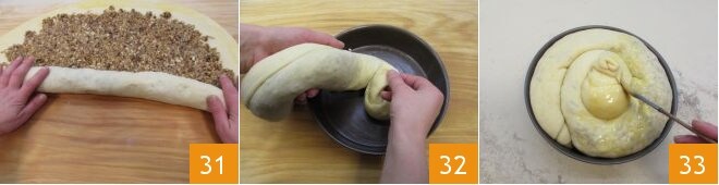 Comenzad a enrollar la masa sobre sí misma 31, a medida que la alargáis ligeramente pasando las manos desde el centro hacia el exterior. Cerrad bien los bordes para evitar que salga el relleno. Tomad un molde de 22 cm de diámetro enmantecado y enharinado 32: comenzad disponiendo uno de los extremos del rollo en el centro y empezad a enrollarlo sobre sí mismo dentro del molde, para crear una forma espiral. Dejadlo fermentar en el horno apagado con la luz encendida otros 30 minutos. Luego, pincelad con el huevo toda la superficie de la gubana 33.