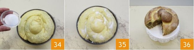 Espolvoread con el azúcar 34 y hornead en horno estático precalentado a 170°C durante 60 minutos (o podéis cocerla en horno ventilado precalentado a 145°C durante 40-45 minutos) 35. Transcurrido el tiempo de cocción, sacad el molde del horno y dejad reposar 10 minutos antes de servir vuestra gubana 36!