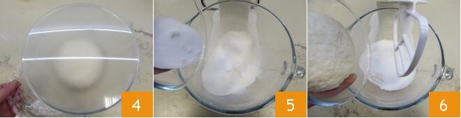 El lievitino deberá duplicar su volumen 4: si no ha alcanzado el volumen necesario, dejad que fermente un poco más. Ahora tomad una batidora con gancho y verted la harina tamizada y el azúcar 5, luego añadid también el lievitino 6.