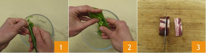 Para preparar los guisantes guisados con panceta, primero desenvaina los guisantes 1 recogiéndolos en un bol, deberías obtener unos 450 g 2. Pasa a la panceta: córtala primero en lonchas 3.