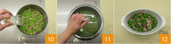 Moja con el agua 10 y cubre con la tapa dejando que cocine unos 12-13 minutos, removiendo de vez en cuando 11. Ajusta de sal al gusto teniendo cuidado con la panceta que es salada. Termina la cocción, apaga y sirve tus guisantes con panceta 12!