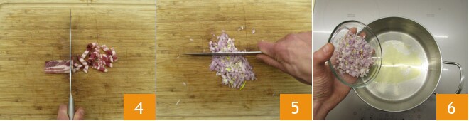De estas lonchas obtén tiras 4. Pica la chalota 5 y muévete a los fogones. Calienta un chorrito de aceite en una cacerola y añade la chalota 6.