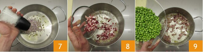 Cocina durante dos minutos a fuego medio-bajo con una pizca de sal (opcional) 7, luego añade la panceta y cocina 3-4 minutos 8. Agrega los guisantes 9 y una pizca de sal.