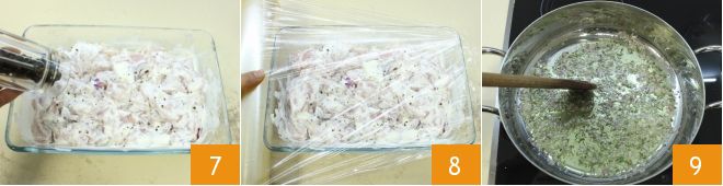 agregad el pollo junto con su salsa de marinada (10-11), dejad dorar por 10 minutos y luego aromatizad la preparación con nuez moscada rallada 12, condimentad con pimienta y sal al gusto,