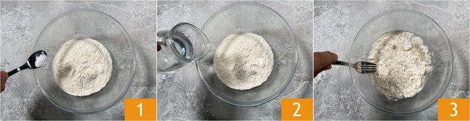 Para preparar los gyoza de gambas empieza con la masa: en un bol une la sal con la harina 1, luego vierte el agua 2 y mezcla con un tenedor 3.