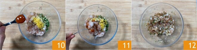 Añade también la salsa picante (sriracha o tabasco) 10 y mezcla bien 11 para obtener una mezcla homogénea 12.