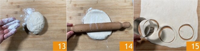 Transcurrido el tiempo de reposo, recupera la masa y enharínala ligeramente 13. Con la ayuda de un rodillo, estírala ayudándote si es necesario con un poco de harina 17, hasta obtener un grosor de aproximadamente medio centímetro. Una vez obtenido este grosor, saca unos círculos con la ayuda de un cortador de 11 cm de diámetro 18.