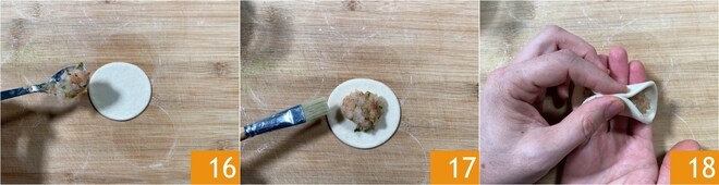 Rellena cada disco con una cucharadita de relleno 19, luego pincela los bordes con un poco de agua 20 y pliega el disco por la mitad sellando bien con los dedos 21.