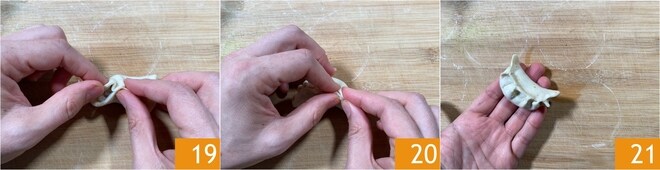 Pellizca los bordes de la masa juntos primero desde el lado izquierdo 22 y luego desde el lado derecho 23. Una vez obtenido el primero, sigue de la misma manera para formar todos los demás 24.