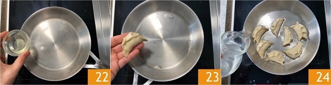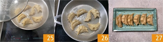Calienta una sartén y vierte el aceite de semillas 25, luego coloca los gyoza y déjalos dorar durante unos 4 minutos a fuego medio, sin tocarlos 26. Una vez que estén bien dorados en la base, vierte el agua en la sartén (ten cuidado con las salpicaduras) 27.