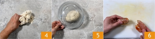 Transfiere la masa a la superficie de trabajo y amasa 4. Una vez obtenida una bola lisa, deja reposar a temperatura ambiente cubierta con un bol 5. Ahora ocúpate de la limpieza de las gambas: separa la cabeza del caparazón 6, luego elimina el hilo interno.