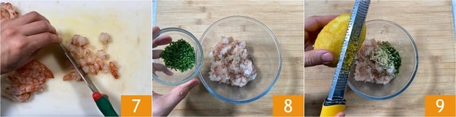 Pica la pulpa de las gambas con un cuchillo 7 y transfiérela a un bol, luego sazona con sal, pimienta, cebollino 8 y ralladura de limón 9.