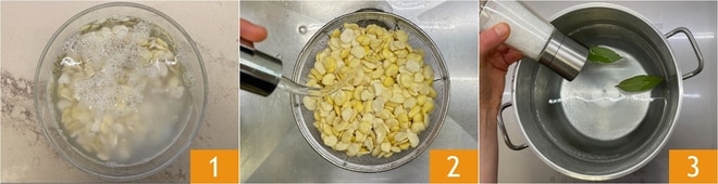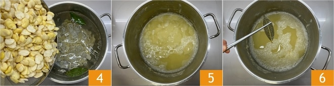 Vierte las habas secas 4 y deja cocer a fuego lento durante 2 horas 5. Al final de la cocción, elimina las hojas de laurel 6.
