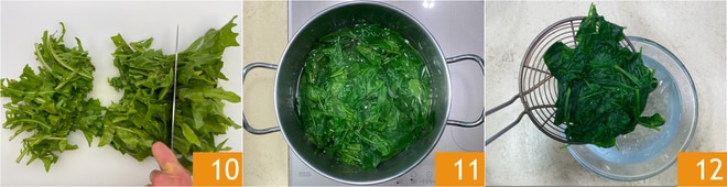 Deja a un lado y pasa a las achicorias: lávalas y elimina la parte final de los tallos 10, luego escáldalas durante unos minutos 11. Escurre las achicorias y transfiérelas a un bol con agua y hielo para mantener vivo el color 12.