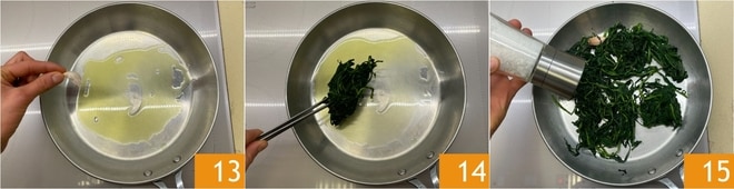 En una sartén, deja que un chorro de aceite tome sabor con un diente de ajo 13, luego añade las achicorias que habrás escurrido para eliminar el exceso de agua 14. Saltea las achicorias con una pizca de sal durante unos minutos 15.