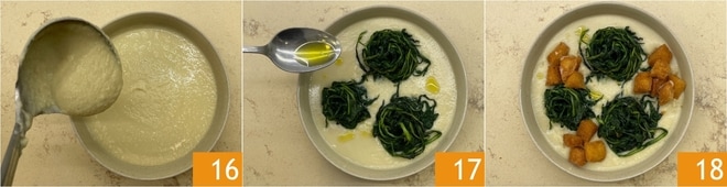 Estás listo para emplatar: vierte el puré de habas en el fondo de los platos 16, coloca las achicorias en forma de nido y condimenta con un chorrito de aceite en crudo 17. Adorna con unos croutones crujientes y sirve inmediatamente tus habas y achicoria!